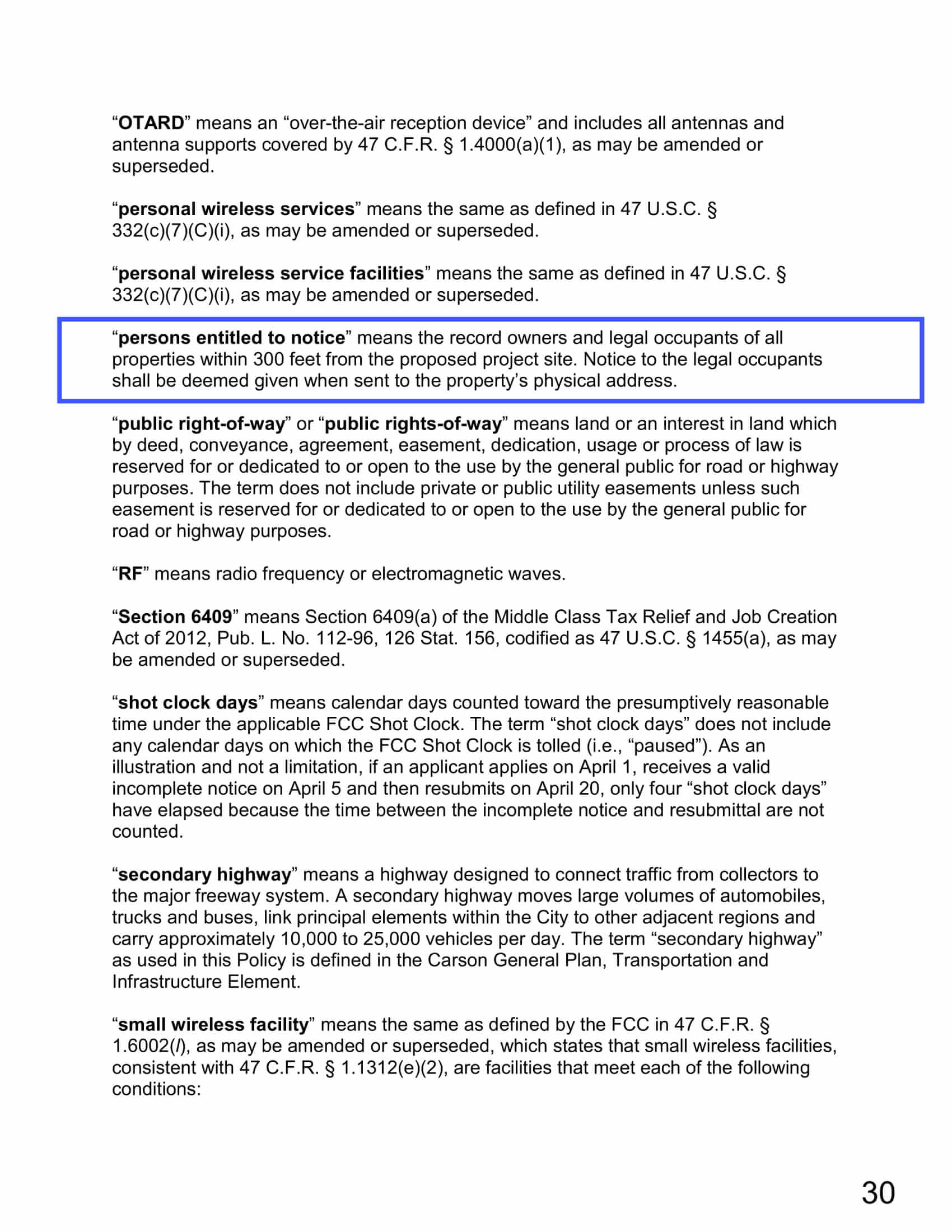 Wireless Communications Facility Applications: For all wireless facility applications, applicants must provide proof that the City’s public noticing requirements have been satisfied. A sample notice to affected property owners must be included. Applicants are required to notify all property owners within 500 feet of the proposed installation and also provide notice to any parties who have filed written requests for notification